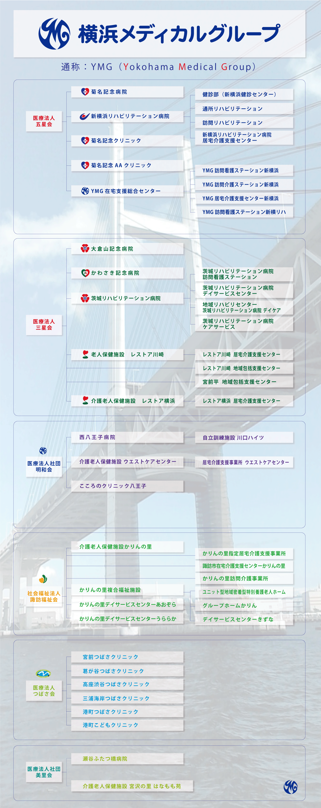 YMGは「患者さんの状況に応じた、迅速かつシームレスな医療・介護の提供」を特徴とした医療グループで、さまざまなタイプの施設があり、急性期から慢性期までのあらゆる状態に応じて医療・介護の提供が行えるよう、スムーズな連携が可能な体制を整えております。
